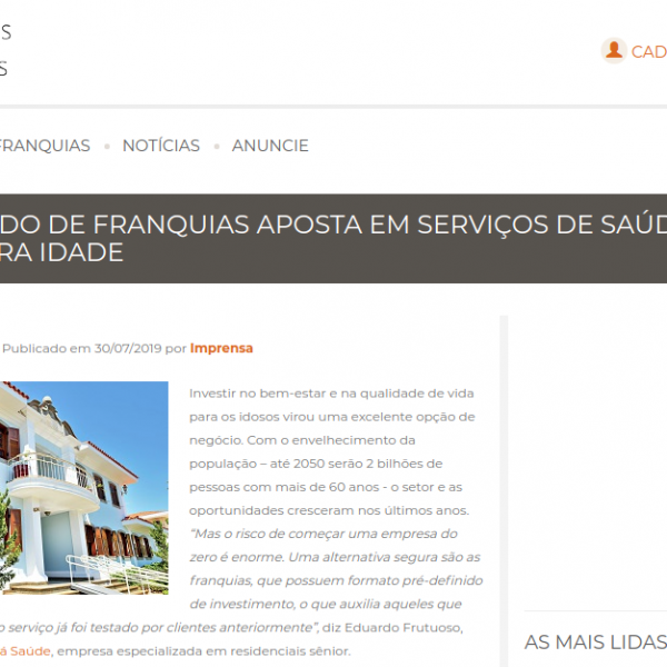 MERCADO DE FRANQUIAS APOSTA EM SERVIÇOS DE SAÚDE PARA A TERCEIRA IDADEEduardo FrutuosoJulho 30, 2019MERCADO DE FRANQUIAS APOSTA EM SERVIÇOS DE SAÚDE PARA A TERCEIRA IDADE Publicado em 30/07/2019 por Imprensa Investir no bem-estar e ... Leia mais...